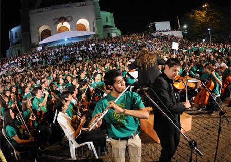 Con motivo del décimo aniversario de la Orquesta Sonidos de la Tierra, fundada por el maestro Luis Szarán, y los 50 años de The Rolling Stones, más de 2.700 jóvenes participaron de un concierto en julio pasado frente a la Basílica de Caacupé, donde grabaron el video homenaje.